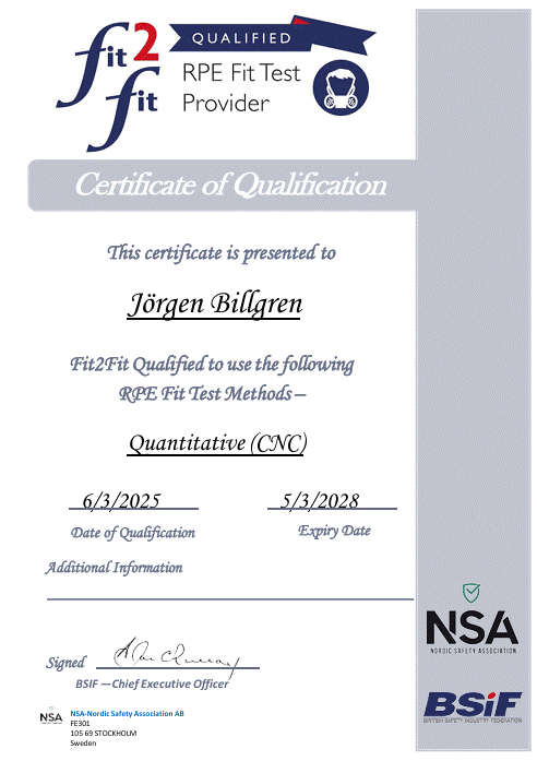 Som certifierad tillpassningsledare blir det en kvalitetsstämpel för att tillpassningstestningen sker enligt ISO Standarden. Fit2Fit följer ISO-16975-3 (som Arbetsmiljöverket hävdar att man bör följa) där det bl a står att tillpassningsledare skall vara behörig.